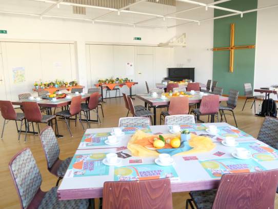In Zeiten in denen der Pfarrsaal nicht von der Kirchengemeinde genutzt wird steht er für Feiern und Veranstaltungen zur Verfügung und kann gemietet werden.